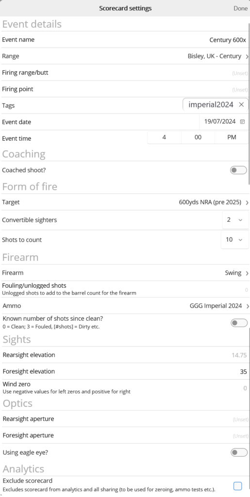 Fouling/unlogged shots – If you blew off, you may wish to add unlogged shots here, primarily for the purposes of keeping the barrel count accurate. Note it is possible to add a scorecard with no logged shots, for example if you visited the zero range.